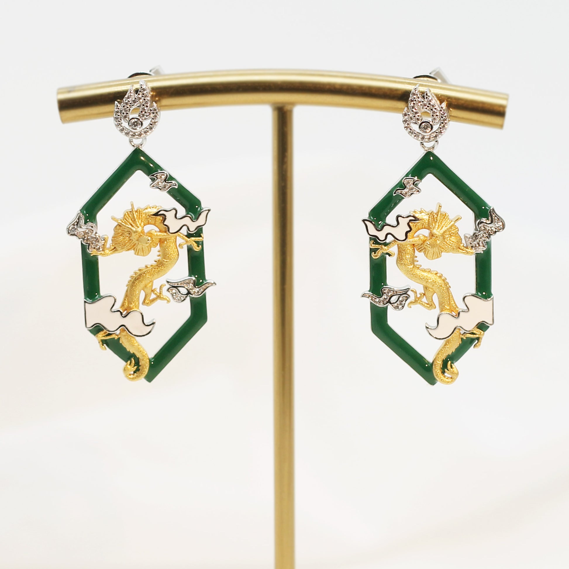 Crafted from 925 sterling silver and plated with 18K gold for durability, this Earring features an Asian Loong flying among the clouds, with the edges accented by cold enamel and sparkling zirconia. It’s the perfect gift for her or yourself.