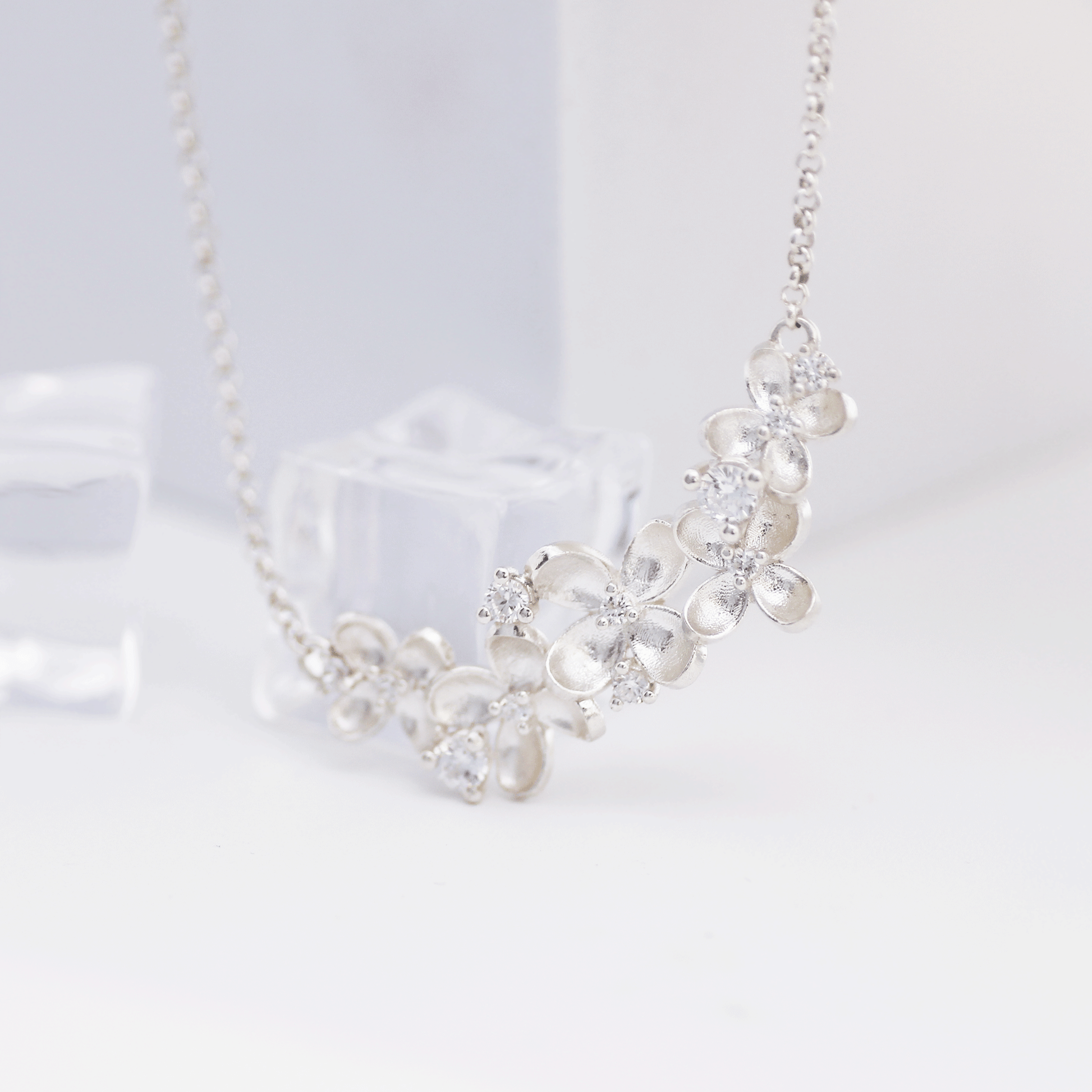 Handcrafted from 925 sterling silver, this necklace features a delicate osmanthus flower design, adorned with sparkling white zirconia that shimmer like sunlight through a grove in bloom. A perfect gift for her – or a lovely treat for yourself.